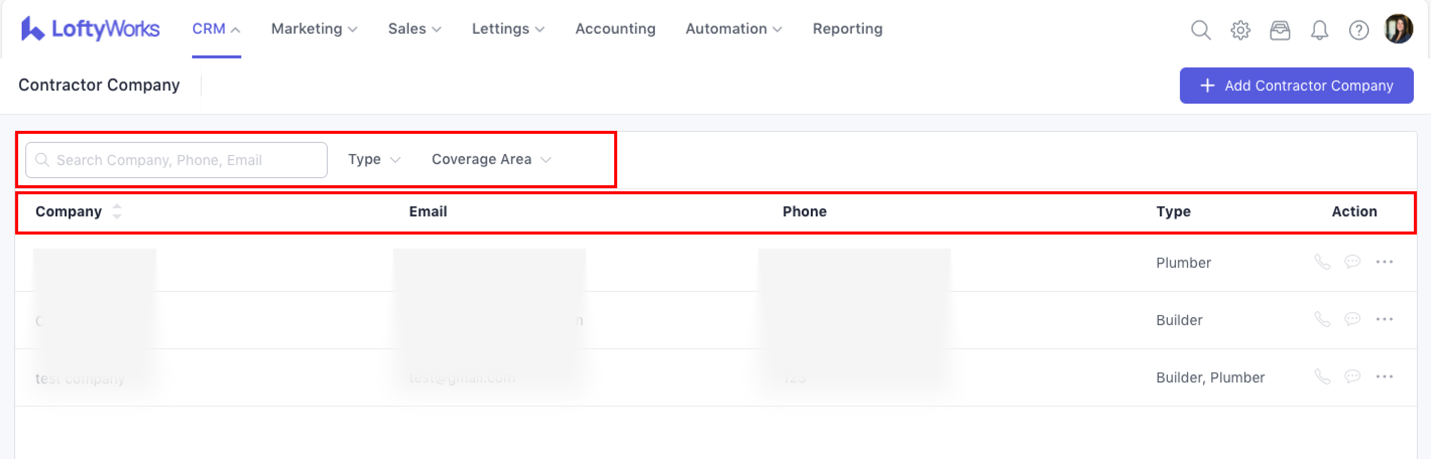 You can search contractor companies by name, phone or email, and filter by: