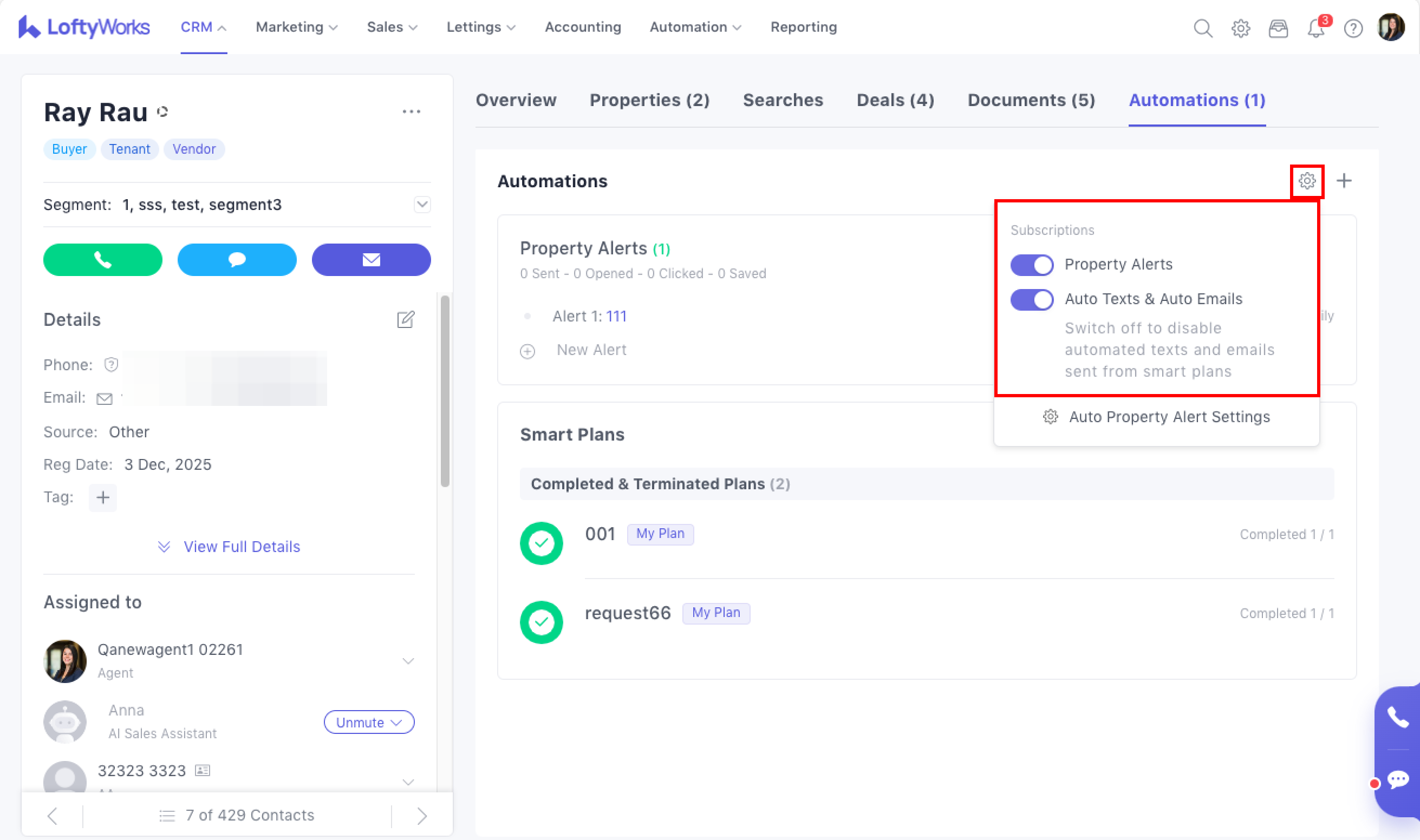 The Automations tab allows you to view and manage automated actions linked to the contact, including Property Alerts and Smart Plans. This tab works closely with the Contact Searches Tab to ensure automation and preference profiles stay in sync.