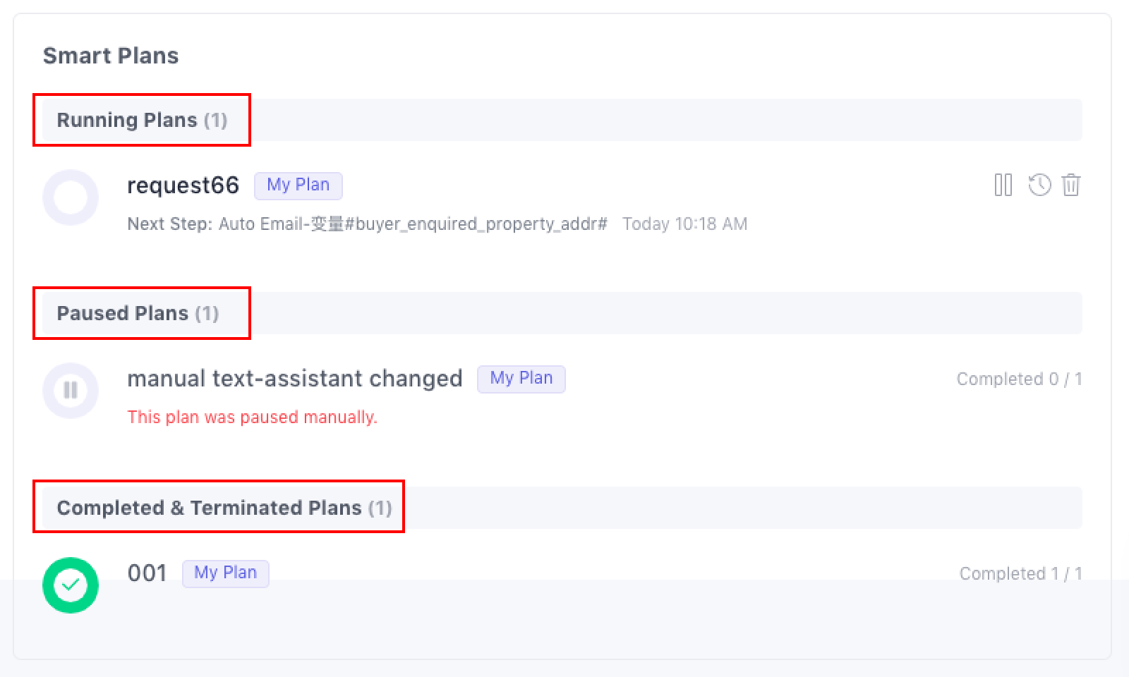 To help you stay on track, Smart Plans are organised into three distinct categories based on their current status:Running, Paused, Completed & Terminated.