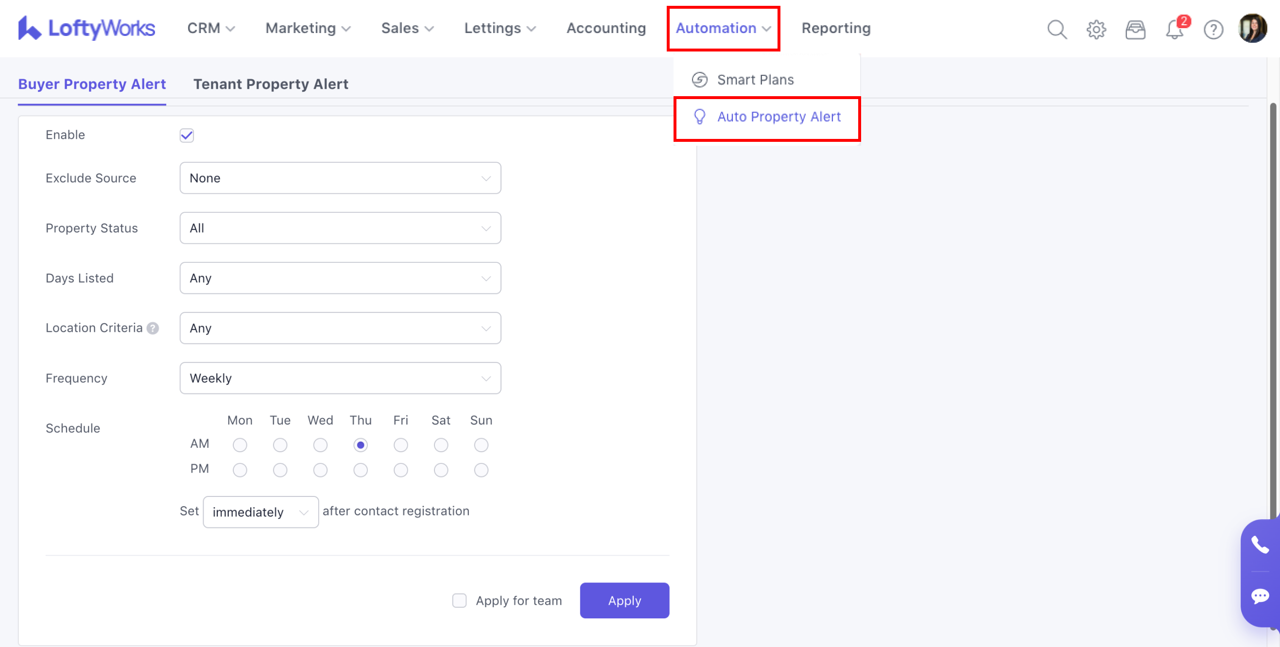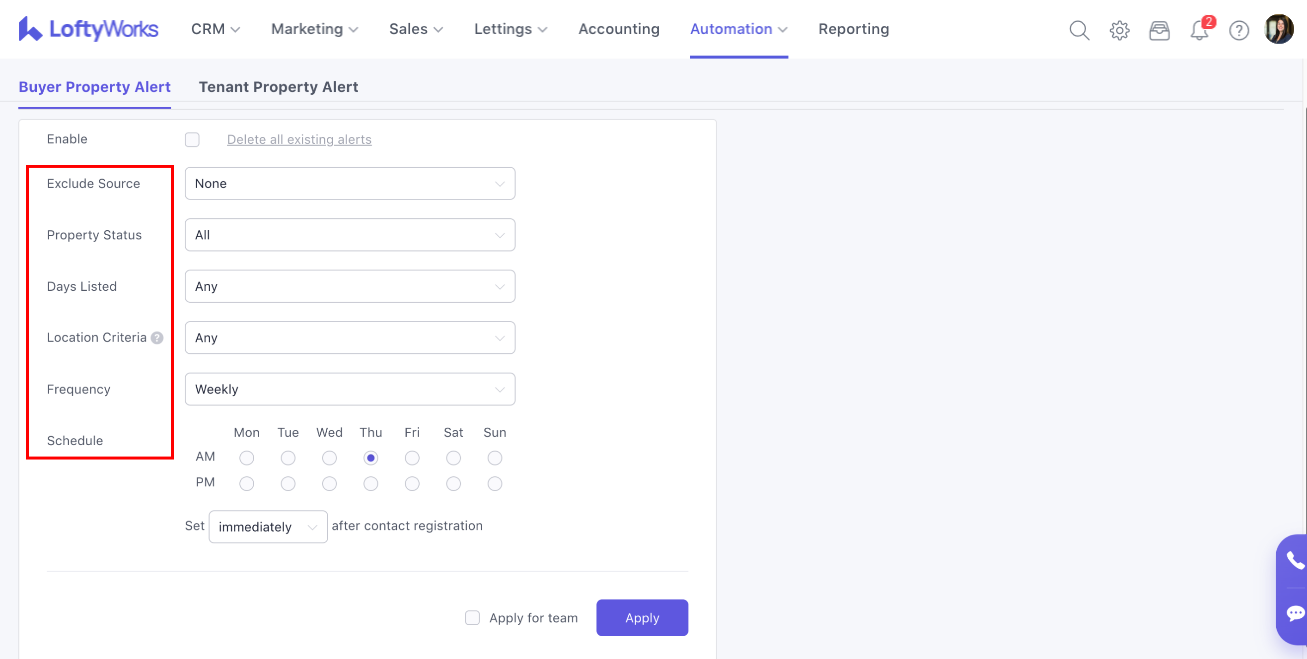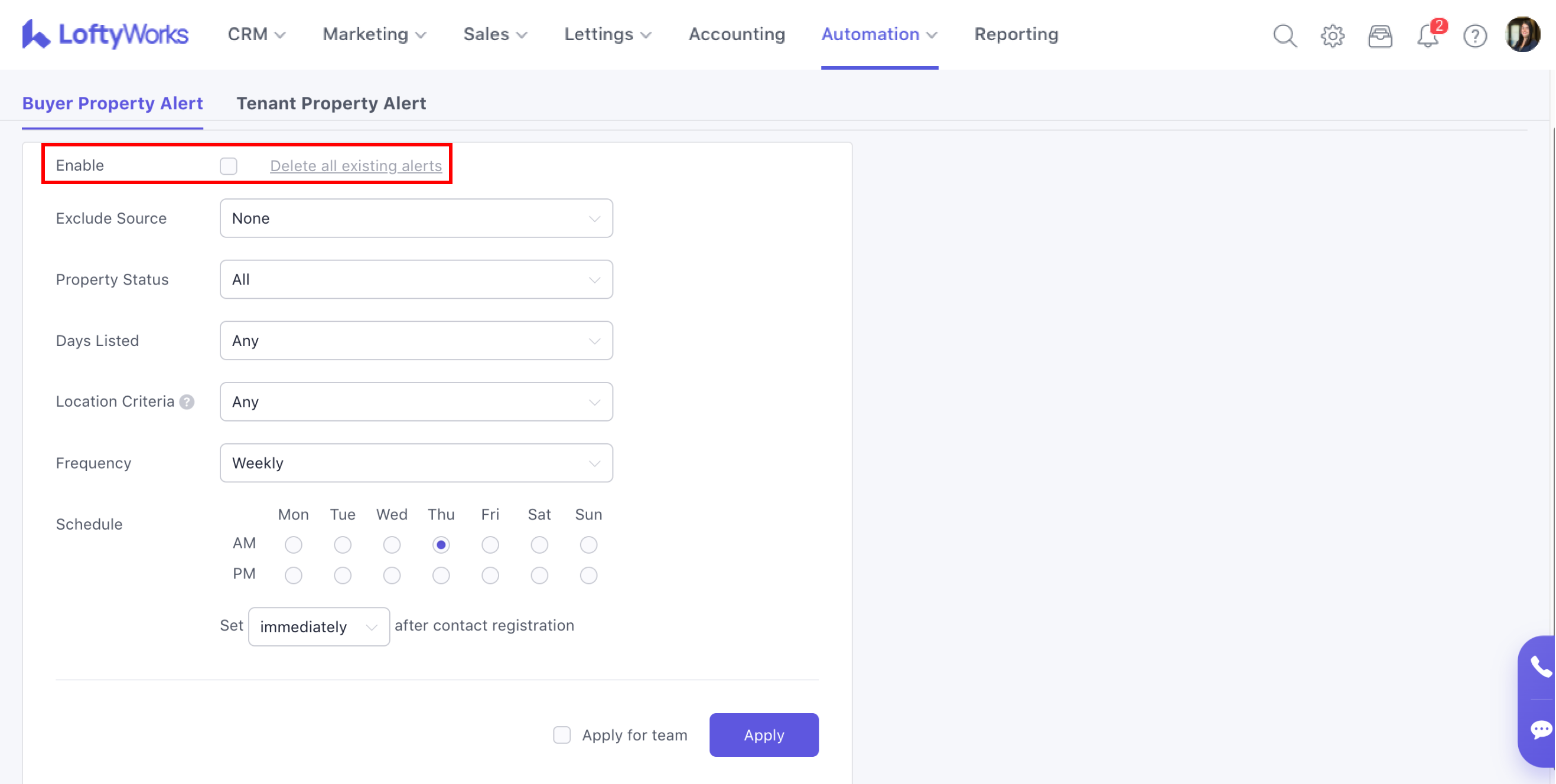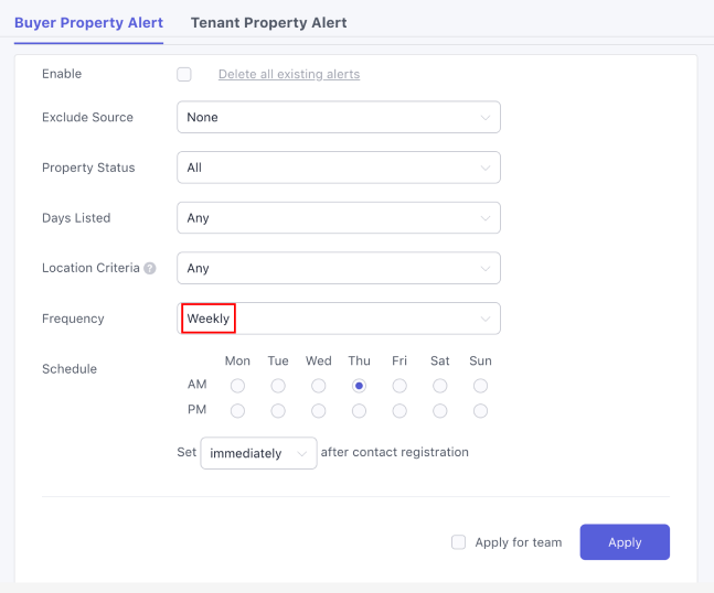 To enable Automated Property Alerts, select the Enable tick box and click Apply in the bottom-right corner. If you are a Team Owner or Admin and want these settings to apply to all team members, select Apply for team before clicking Apply.