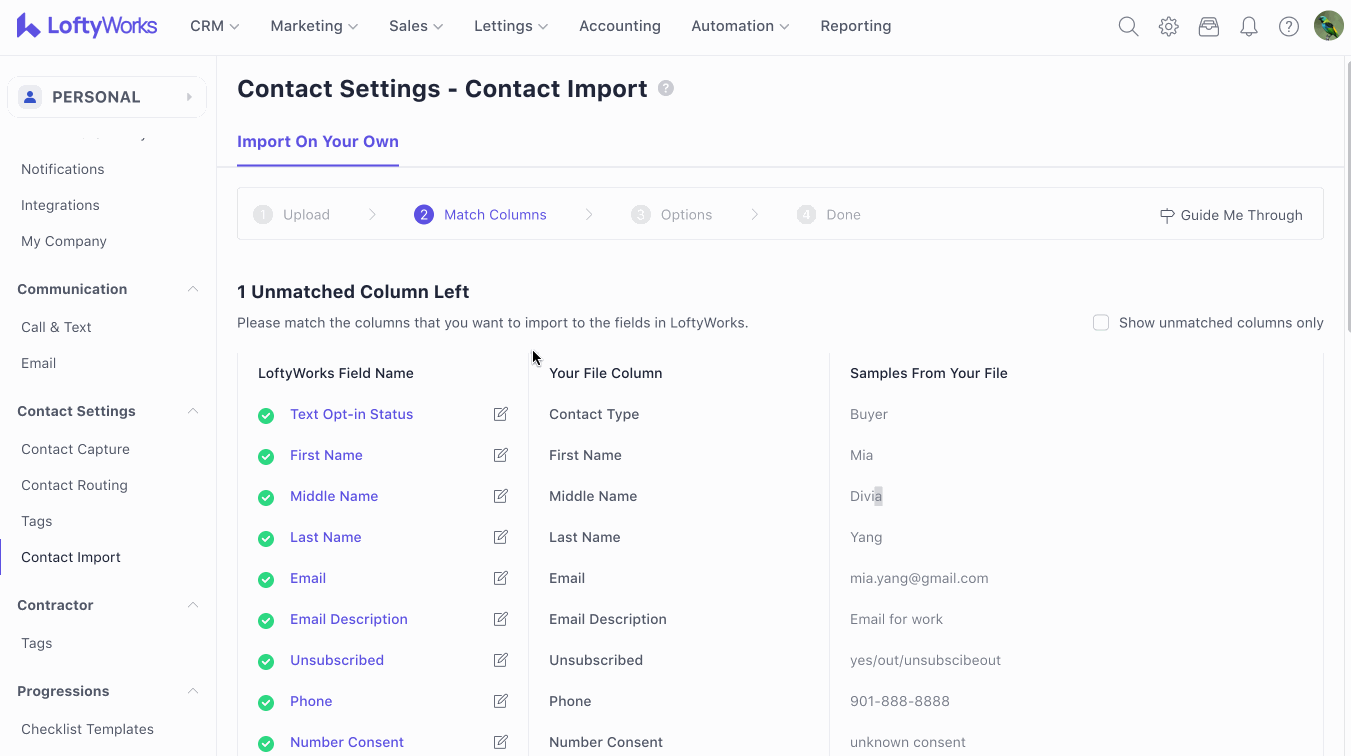 LoftyWorks will attempt to automatically match spreadsheet column names to contact fields.