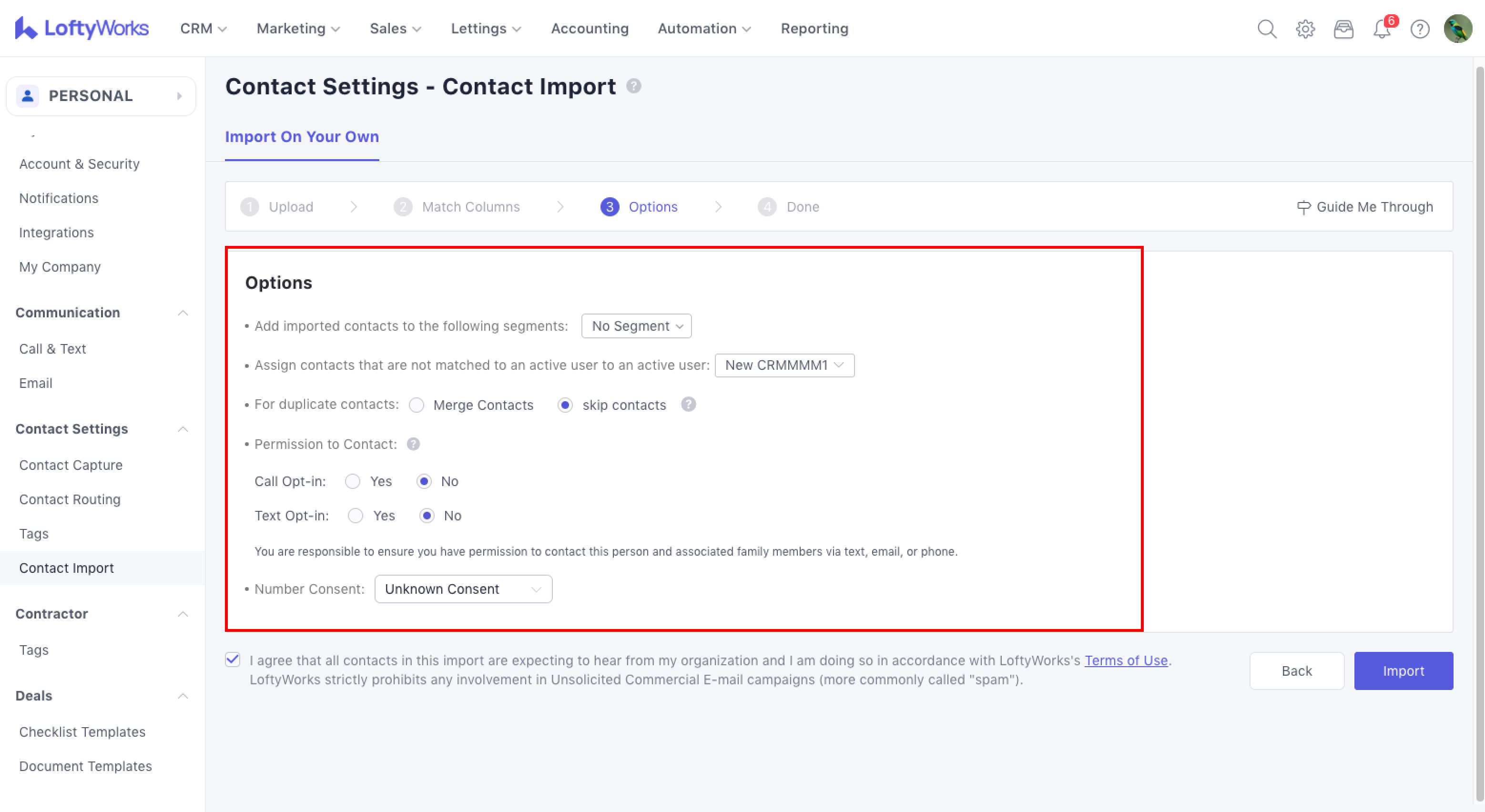 - Select Contact Import under the Contact Settings section
