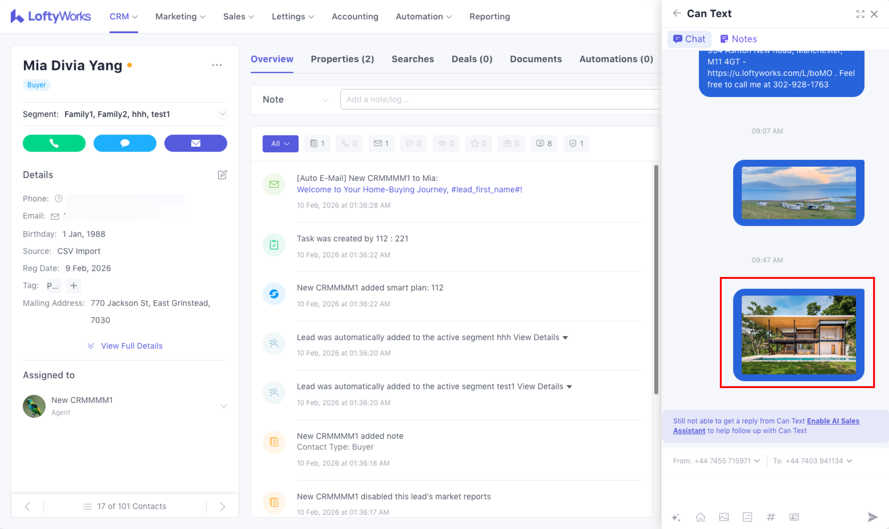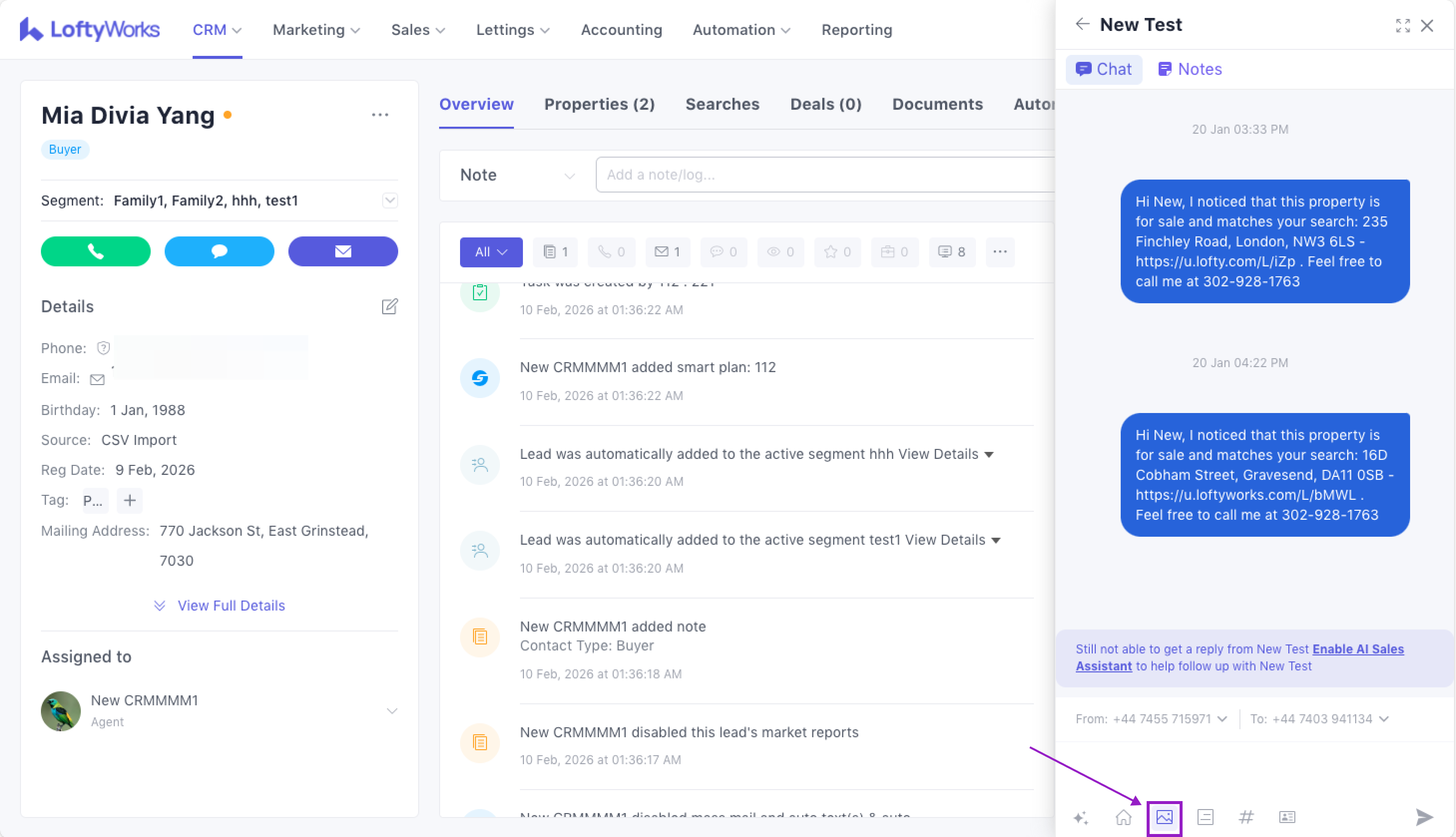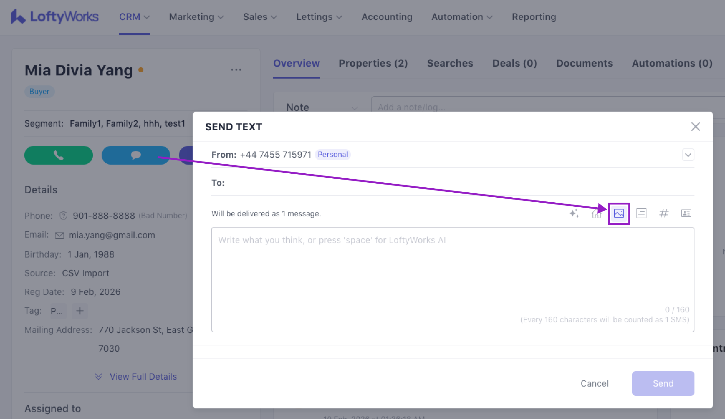 As outlined above, an MMS can only be sent to one contact manually–auto texts, group texts, and mass texts are not currently supported. So, click on any option in the CRM to send a text to one specific contact and the following options will be available to add an image: