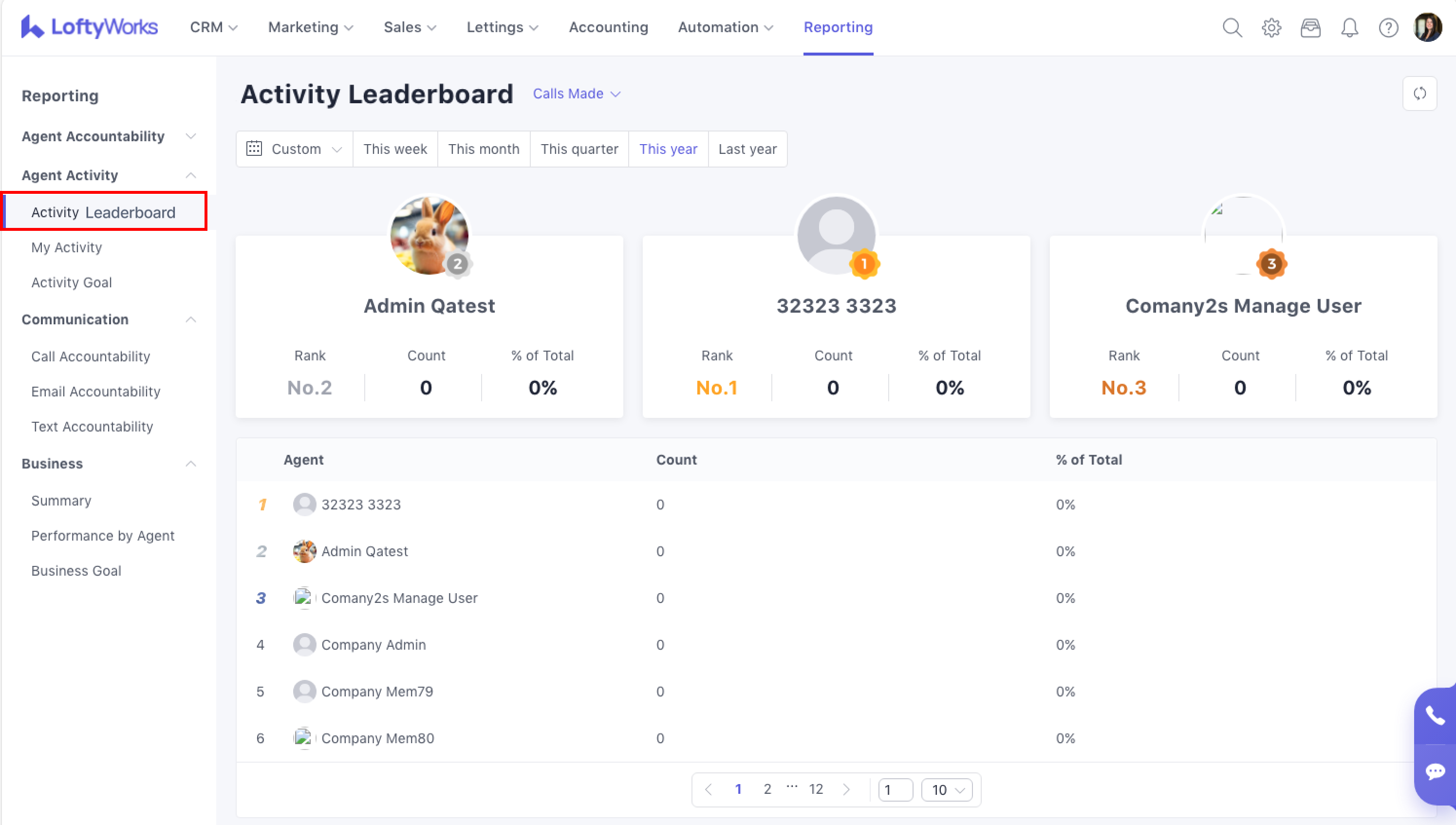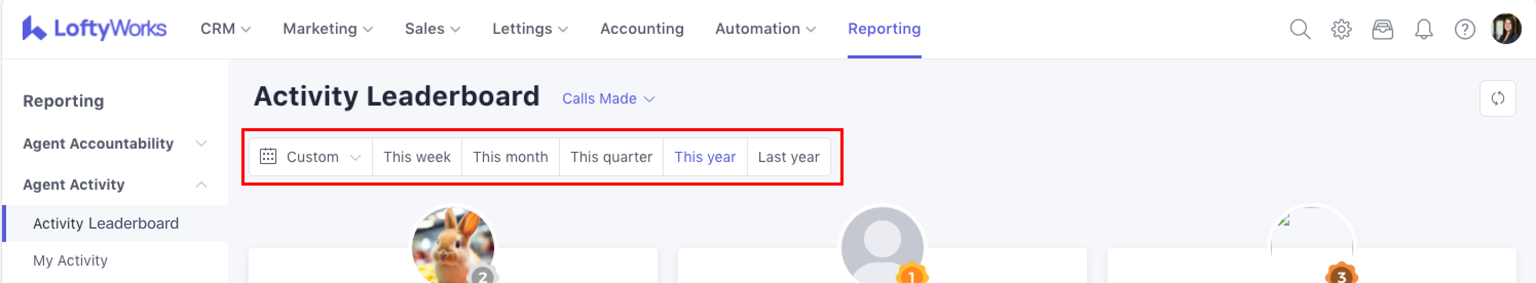 Navigate to the Reporting page and select Agent Activity > Activity Leaderboard. This report is available to all LoftyWorks users. Utilise the filters to sort the activity data by a time range.
