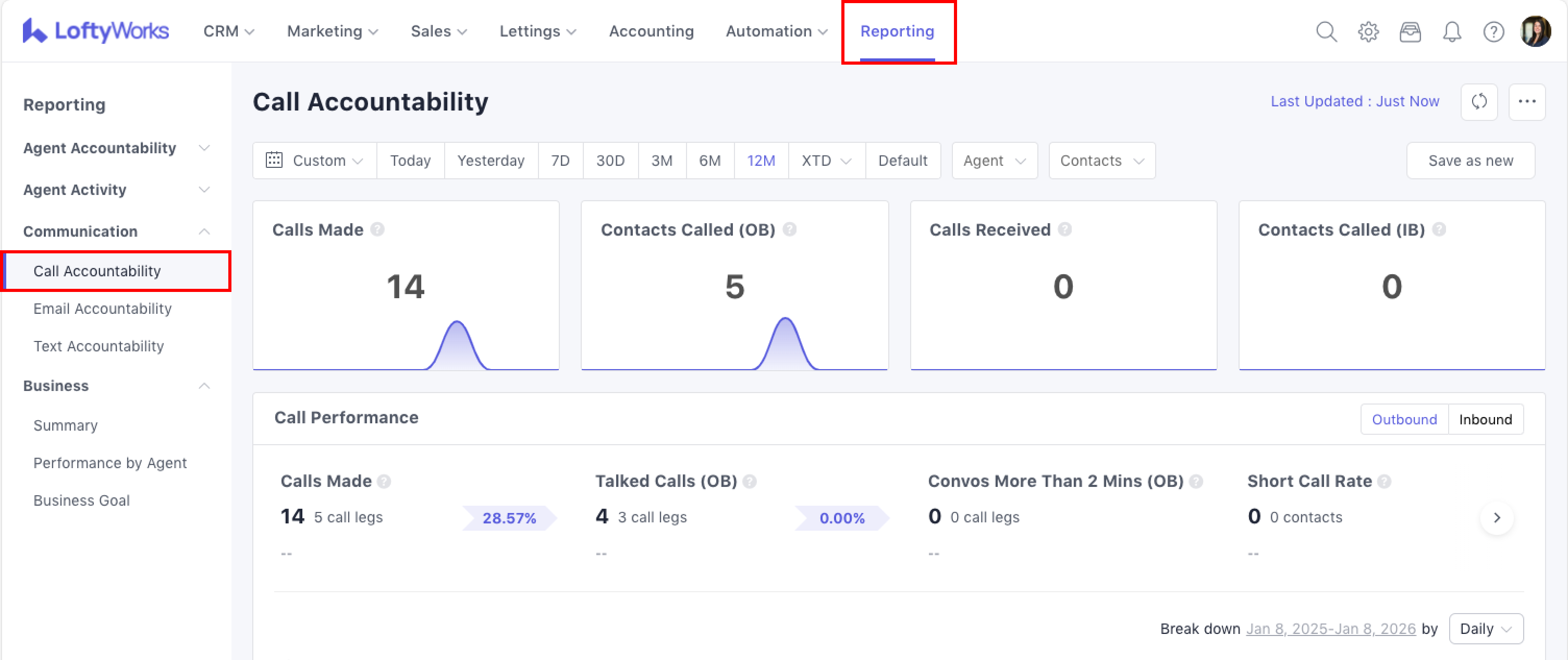 The Call Accountability report is designed to provide LoftyWorks users with insight into the number of calls made, talked, received, missed... These information can be useful in determining how to utilise call effectively in LoftyWorks. This report can be found under Reporting > Communication > Call Accountability.