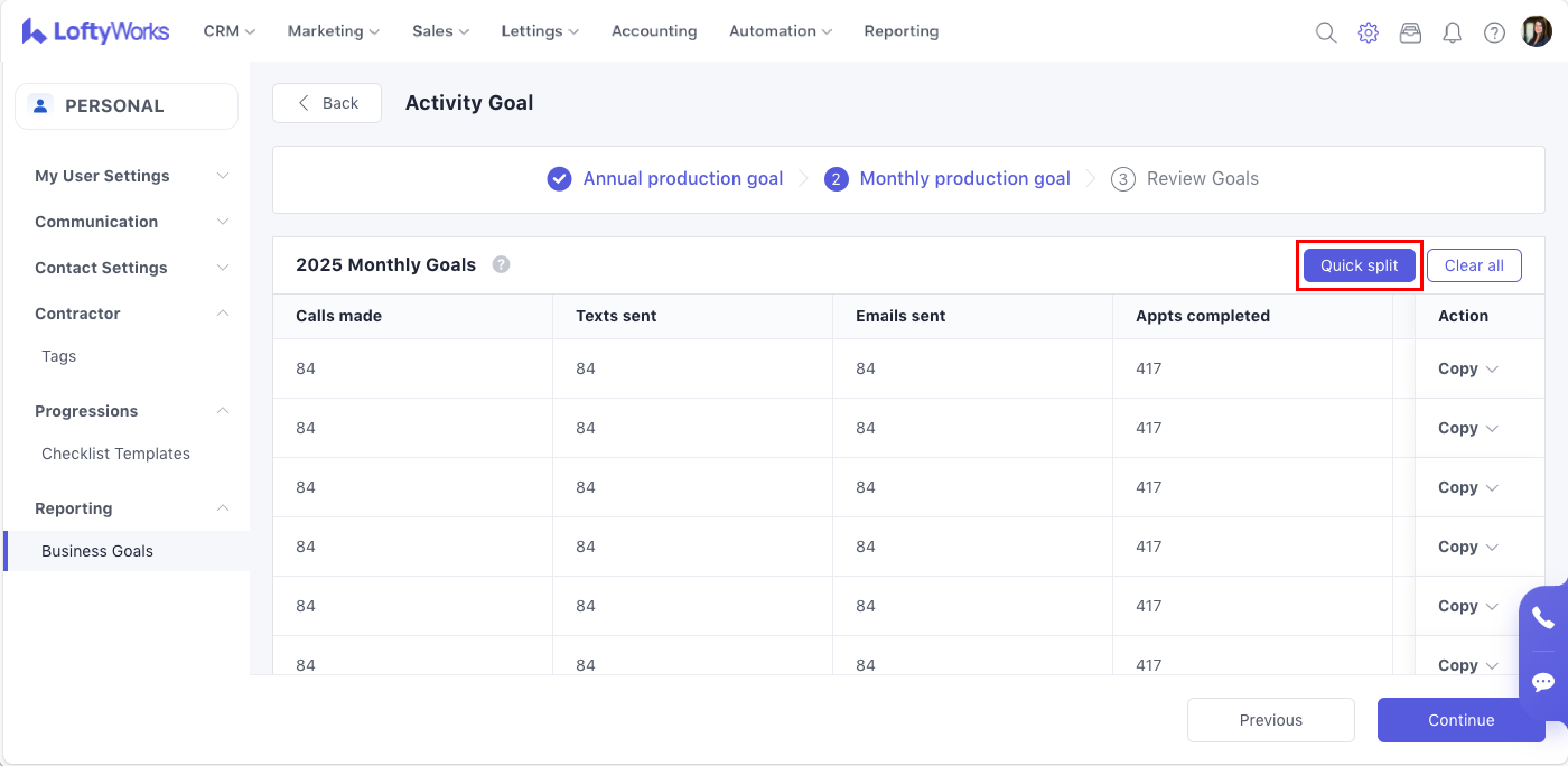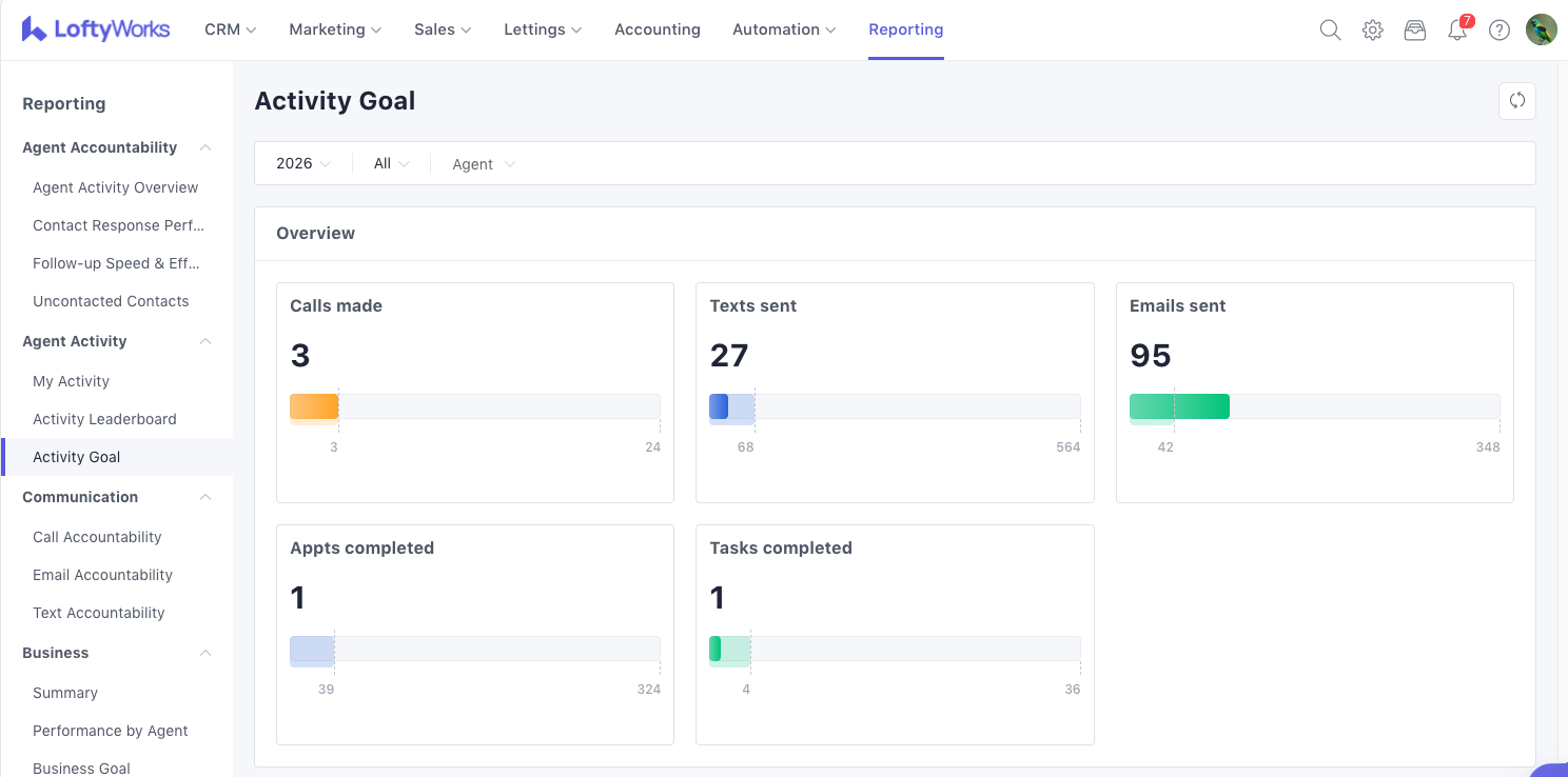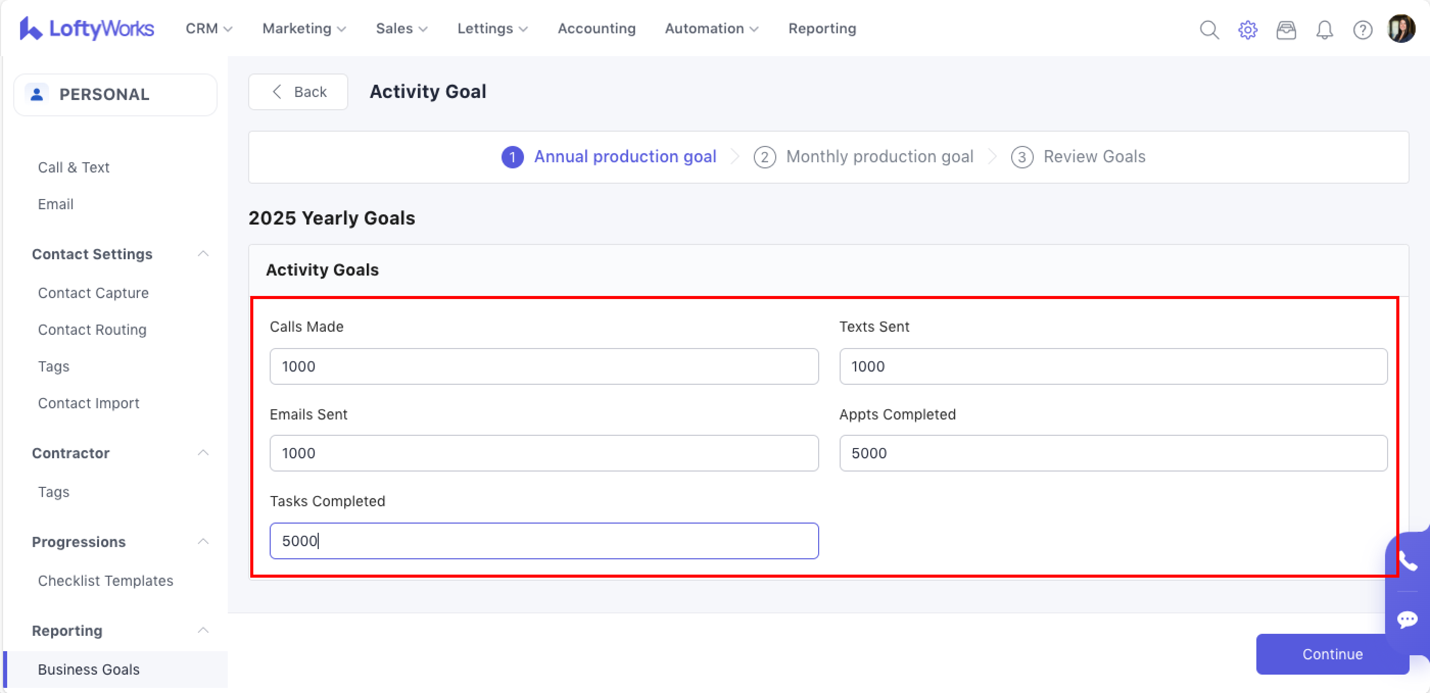 The Team Owner/Admin can set the Activity goals in whichever direction he or she wants to accomplish in the year. Click Reporting > Agent Activity > Activity Goal > Edit goals