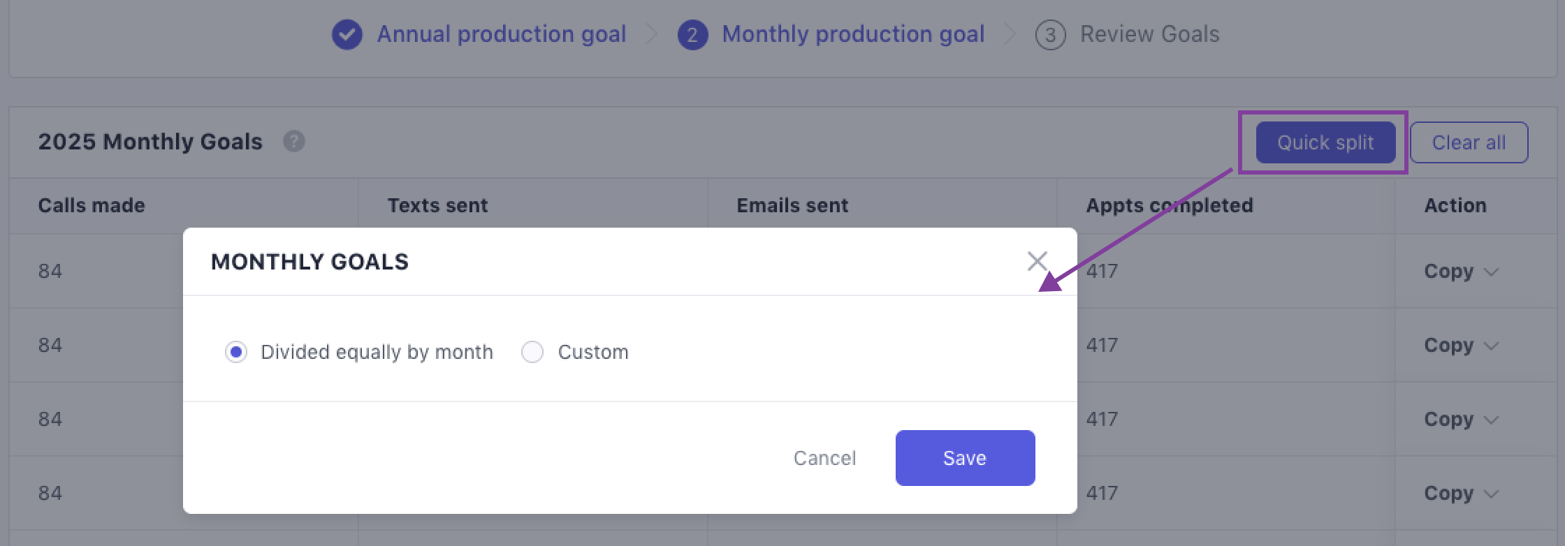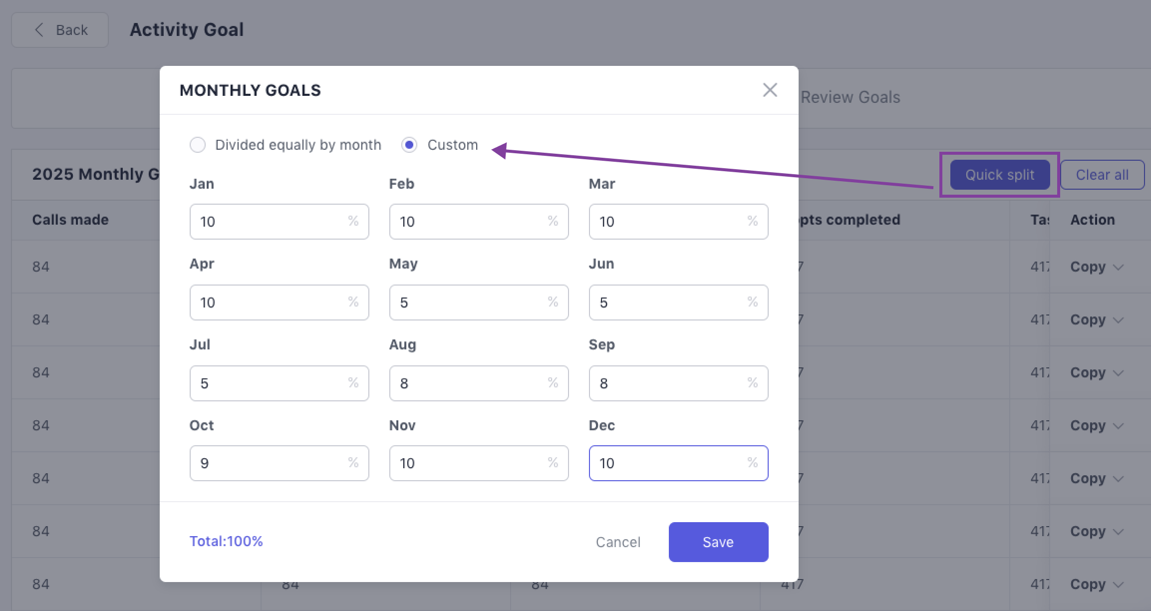 The Team Owner/Admin can start by entering yearly goal and determine how the goal will be distributed (equally divide the volume to each team member, or set them separately).
