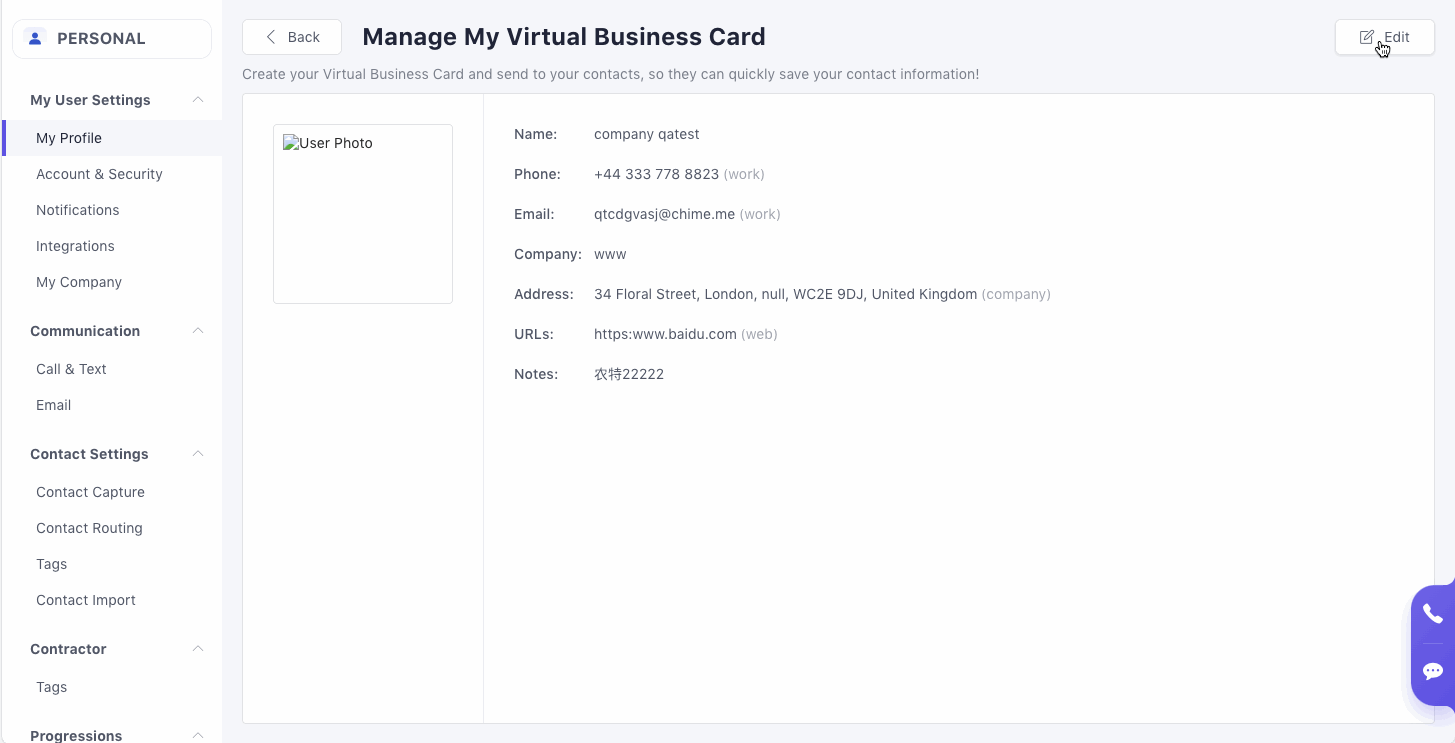 Click Edit to update your Virtual Business Card.