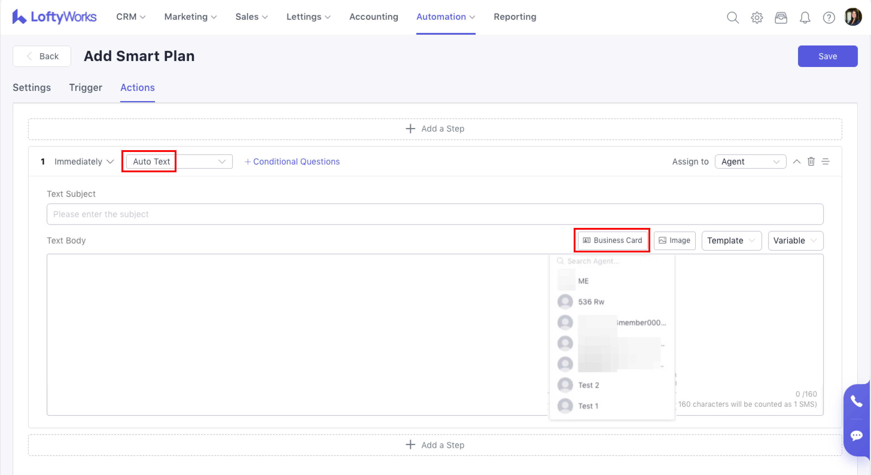 You can also add a Business Card to the smart plan (Auto Text). If the selected agent is inactive or deleted, then the smart plan will be suspended.