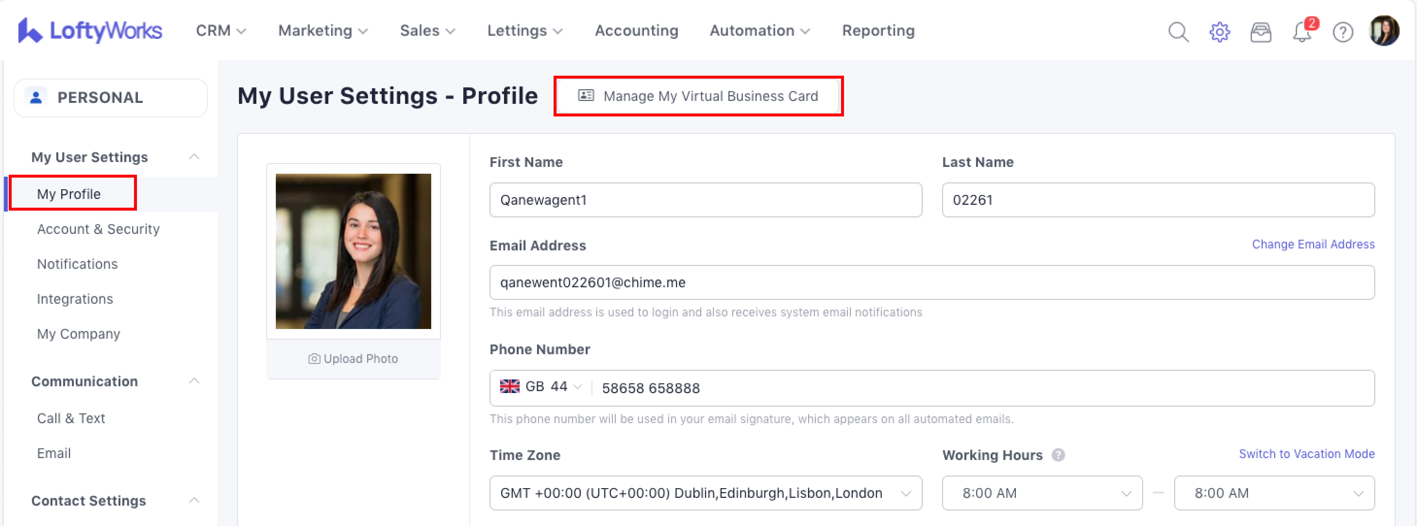 Your virtual business card will already be created for you, using the information on your LoftyWorks user profile. If you edit the business card, it will not edit your LoftyWorks account information. This means you can add a different photo, phone number, email address, etc. to your virtual business card, and that information will not automatically be available on your LoftyWorks user profile.