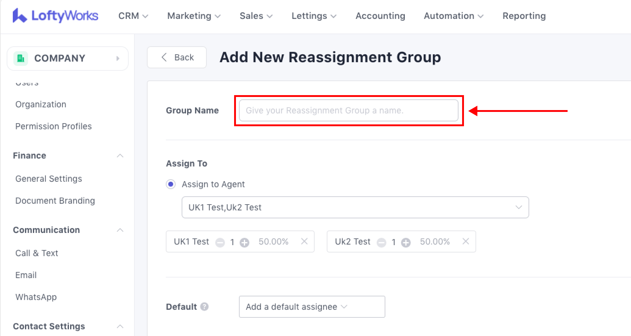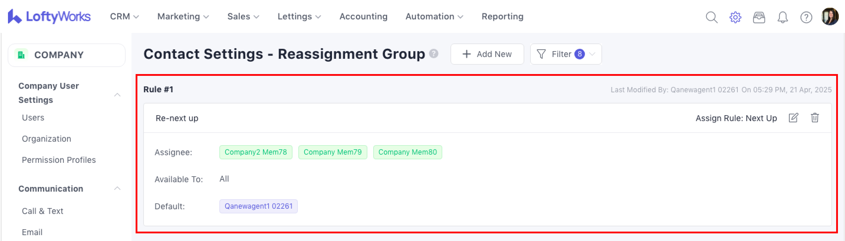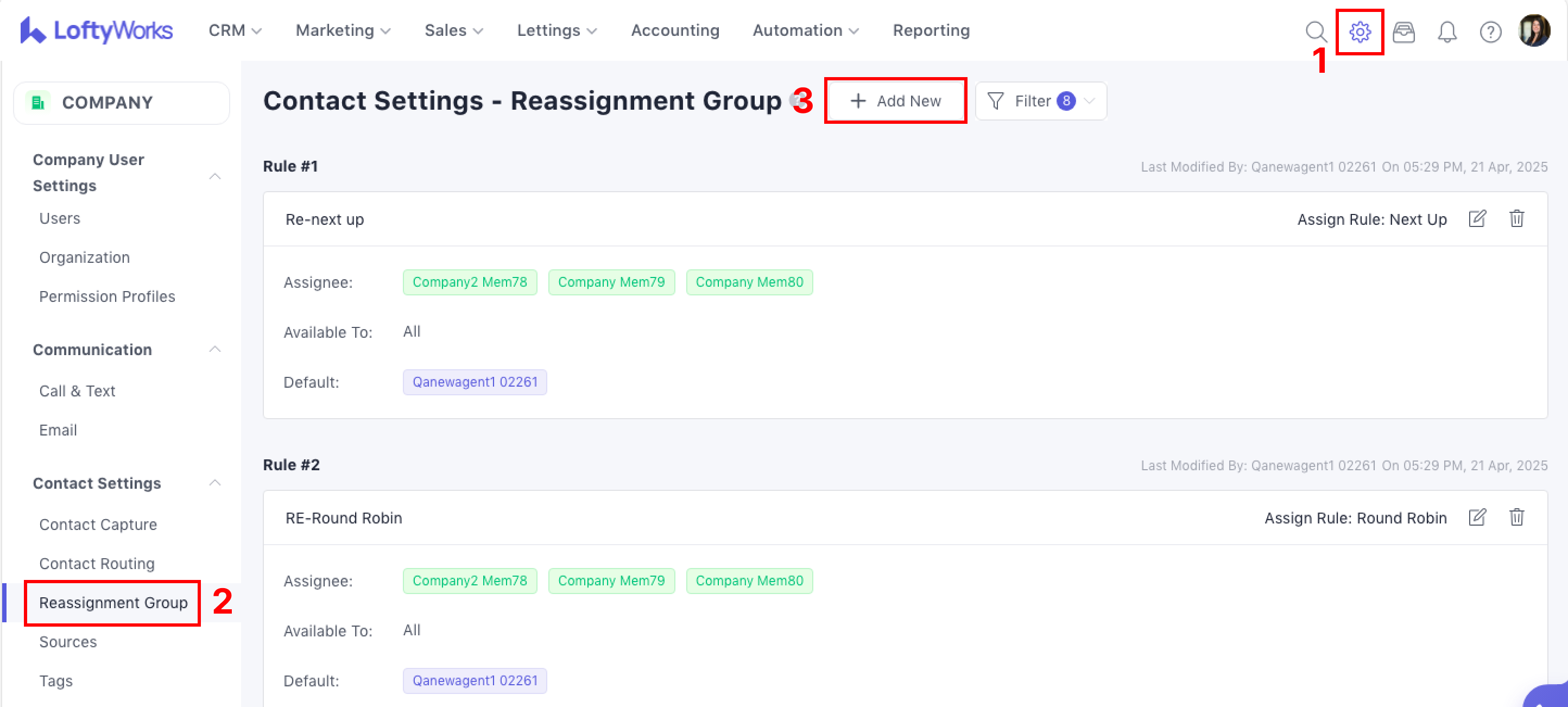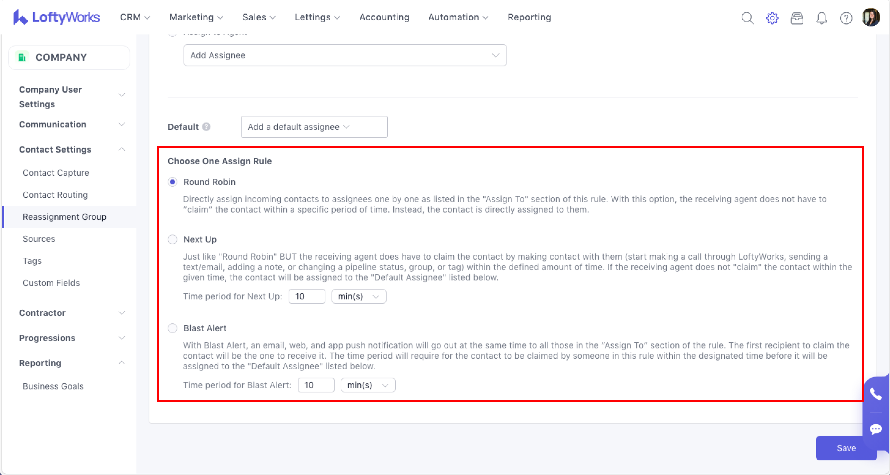 Standard contact routing in LoftyWorks works when a brand new contact reaches the CRM and then the contact routing rule kicks in and sends it to a specific assignee. This "Reassignment Groups" feature, however, is different because it is intended to route contacts that have already been in the system, not new ones.