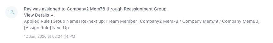 Once the contact has been reassigned, per the Reassignment Group rule, OR the contact has been assigned to the default assignee, a timeline record will be documented on the contact profile that looks like this one: