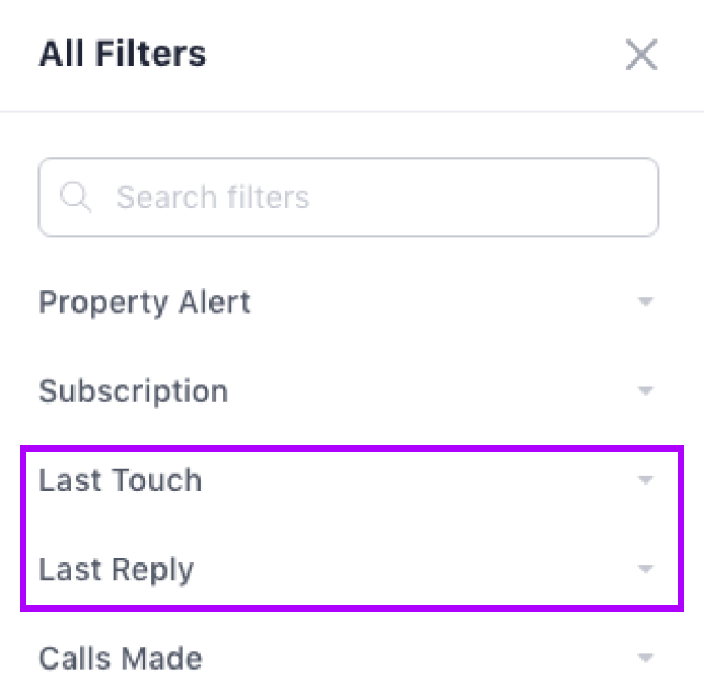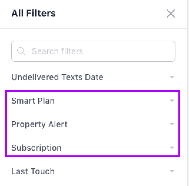 Use this filter to search by subscription status for Smart Plans or Property Alerts. The options for each of these are "Subscribed" or "Unsubscribed". You can also see the following for more information on this topic: Email Subscription Status.