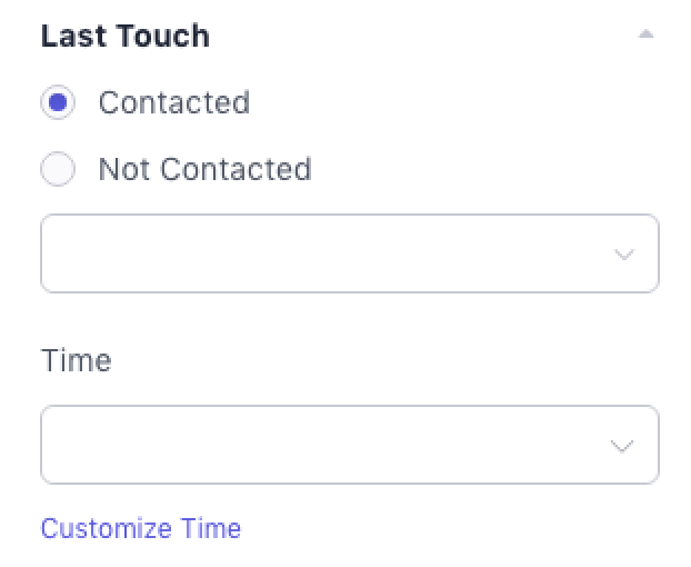 Use this filter to search for contacts who were or were not contacted. The options include all contact methods, including both automatic and manual communication. The last touch can also be sorted by period, either by the pre-selected time intervals in the drop-down menu or by selecting Customised Time to enter a specific number of days.