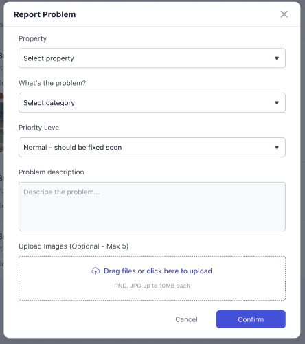 Provide as much detail as possible to help property managers resolve the issue quickly.