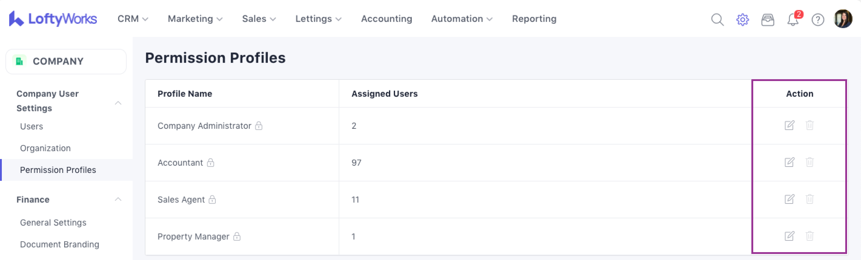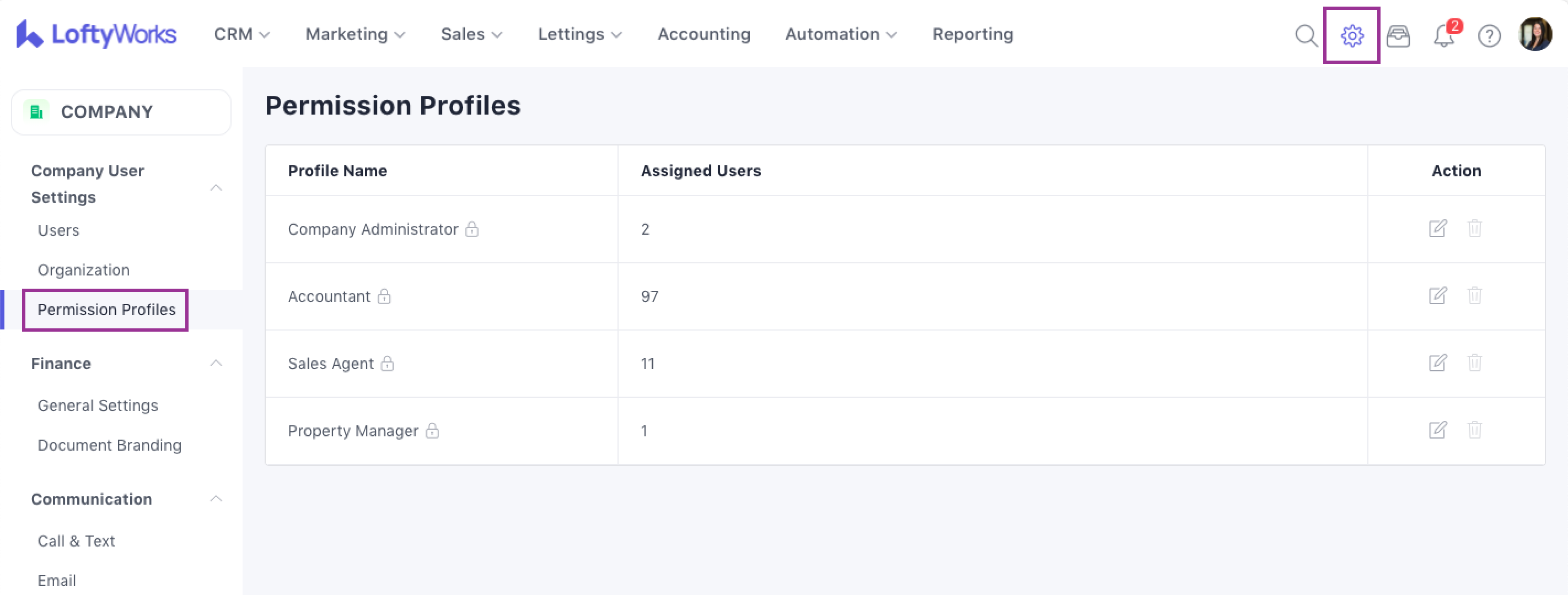 To edit or delete a permission profile, use the edit or delete icons in the rightmost column: