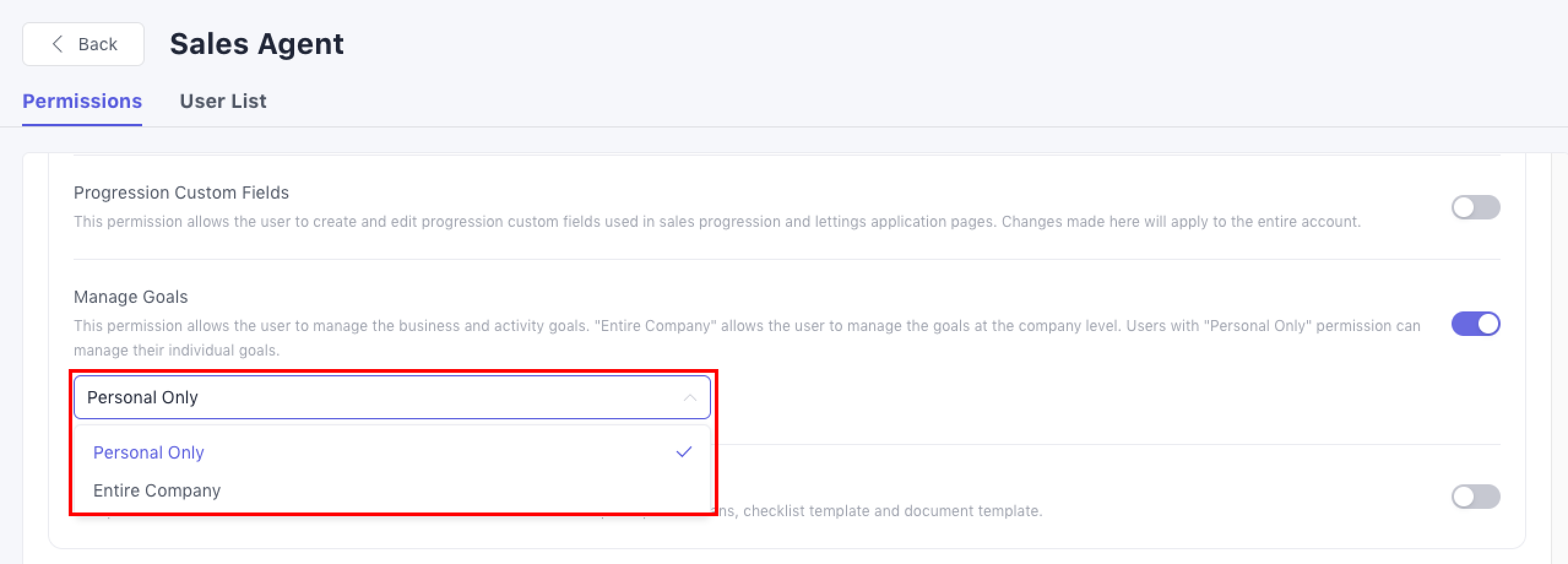 Manage Goals. This permission allows the user to manage business and activity goals. "Entire Company" allows the user to manage the goal at the company level. Users with "Personal Only" permission can manage their individual goals.