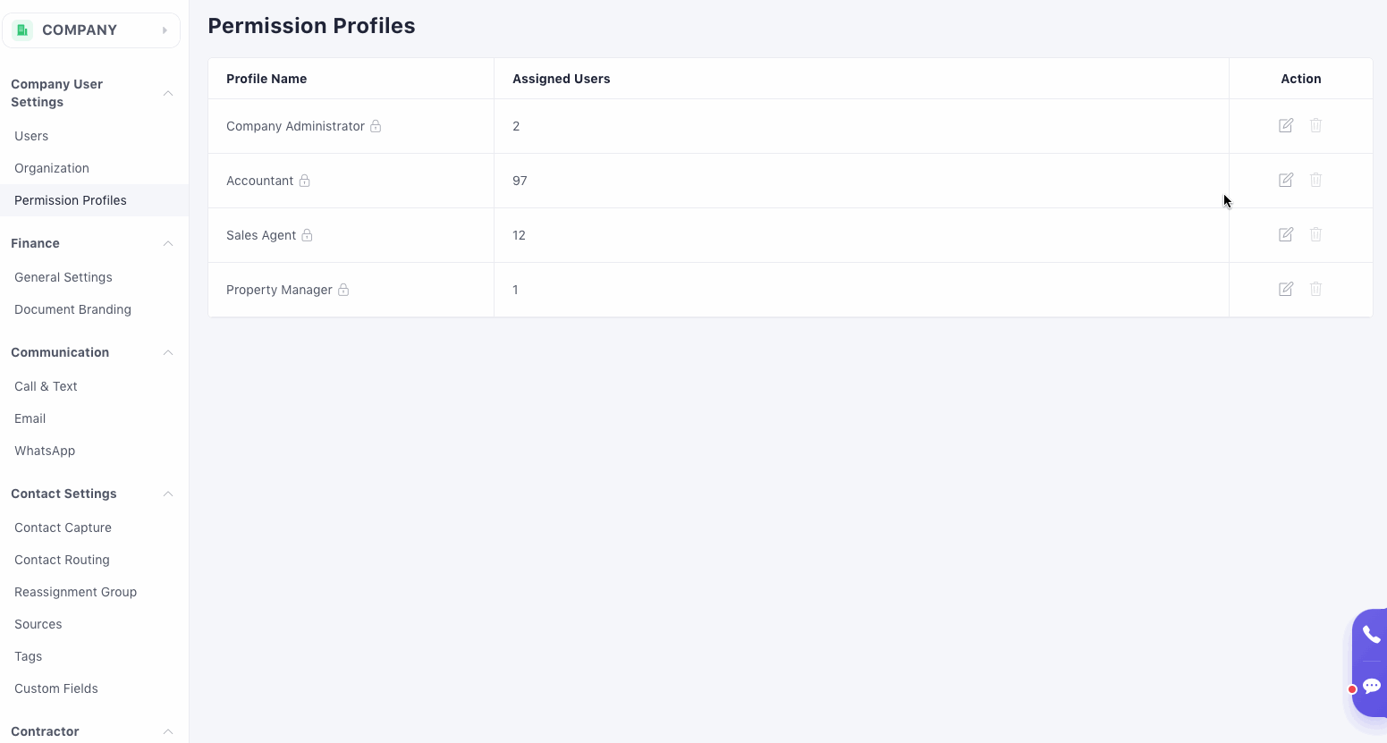 This section grants permissions to manage users, company settings, and profile configurations