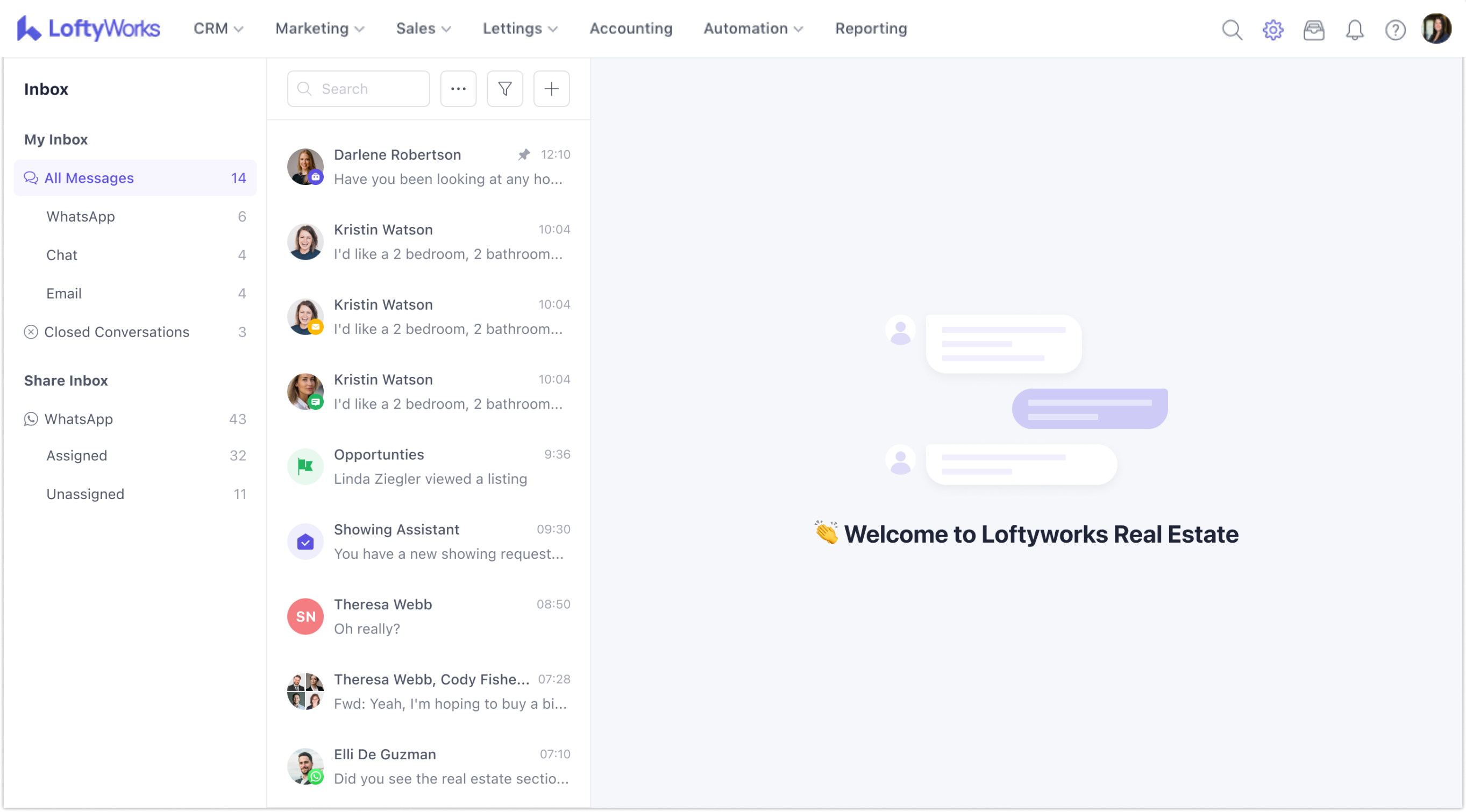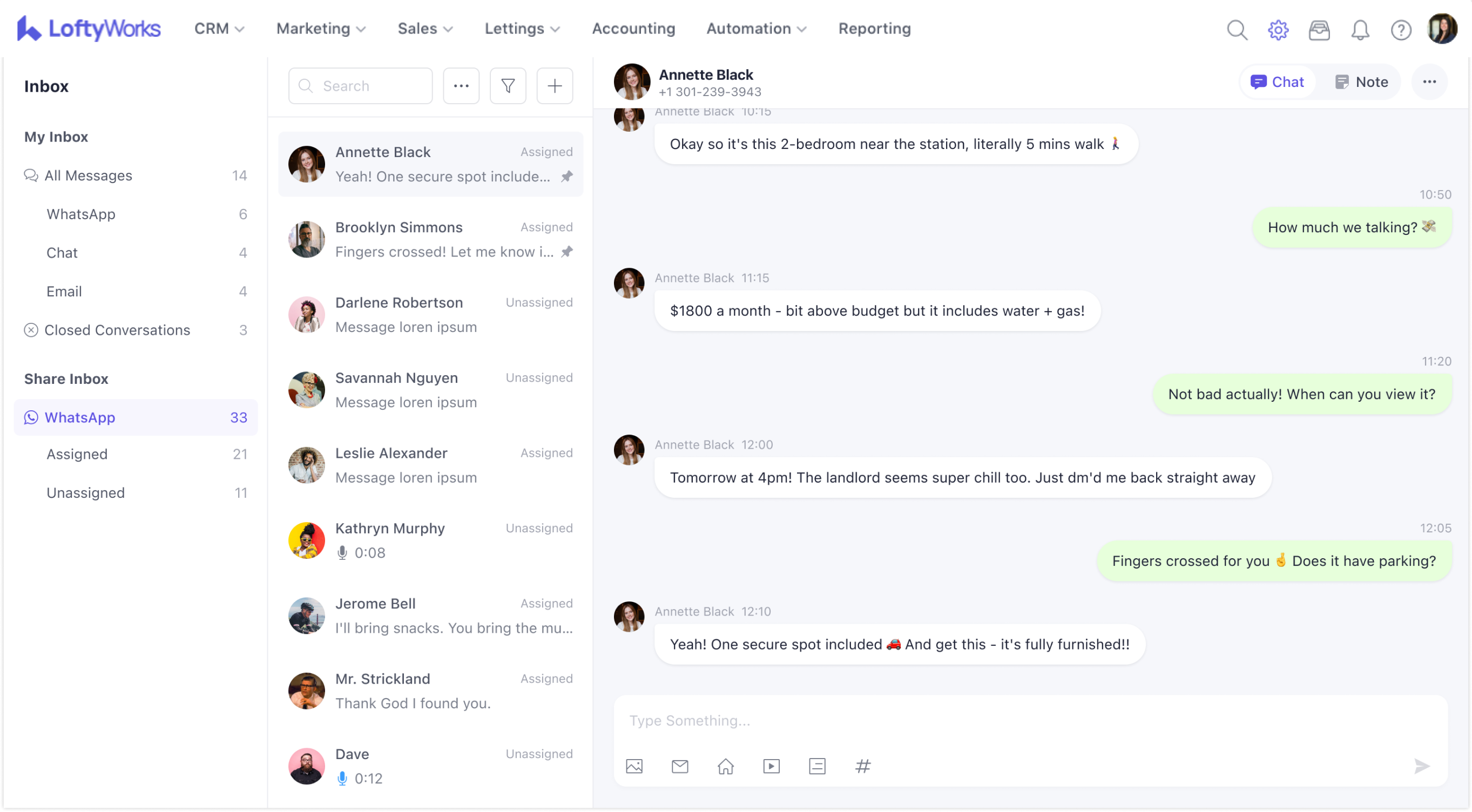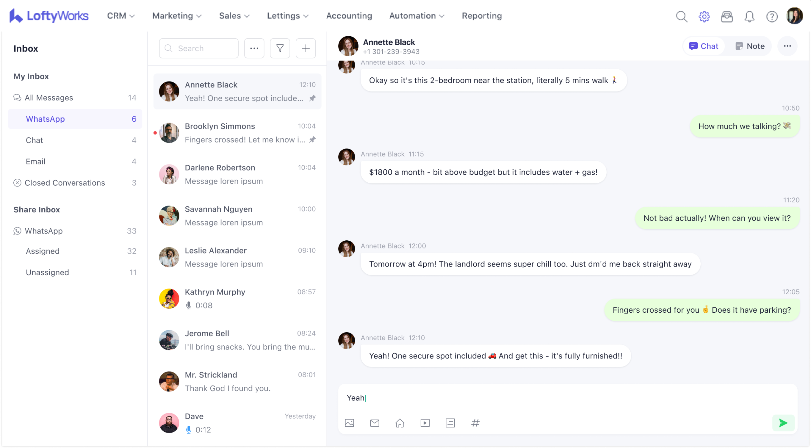 LoftyWorks integrates with WhatsApp Business, allowing your team to send and receive WhatsApp messages directly from the CRM — alongside email and chat, without switching between platforms.