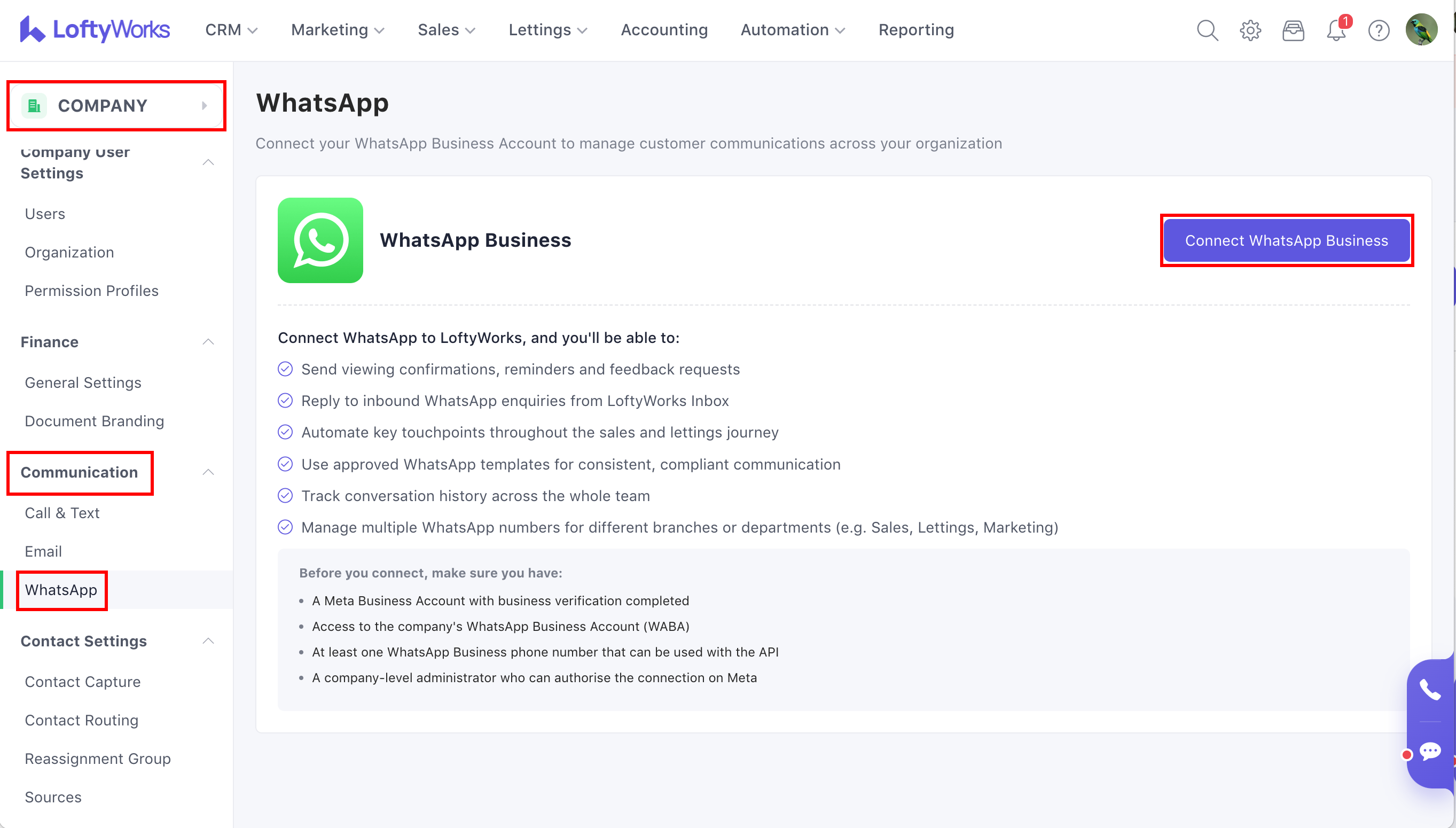 Admins can connect WhatsApp under Company Settings → Communication → WhatsApp. Follow the on-screen steps to link your WhatsApp Business Account (WABA) via Meta.